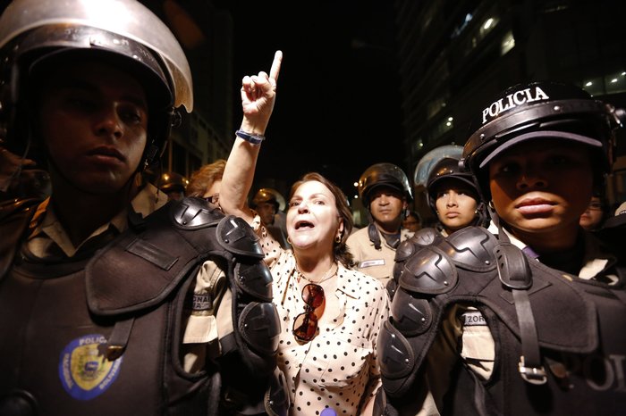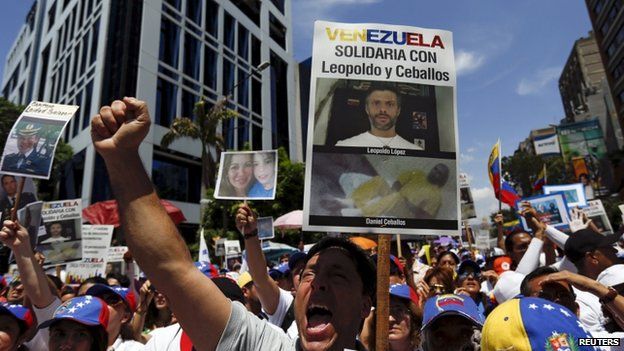 Photo on the Right: Mitzy Capriles de Ledezma, the wife of Caracas Mayor Antonio Ledezma, chants for the release of her husband, as she stands behind two national police officers on guard outside intelligence service police headquarters, in Caracas on Thursday. Mariano Castillo and Ed Payne, Murder Charges Against Venezuela Opposition Leader Dropped, CNN, Feb. 20, 2014, http://www.cnn.com/2014/02/20/world/americas/venezuela-protests/index.html)