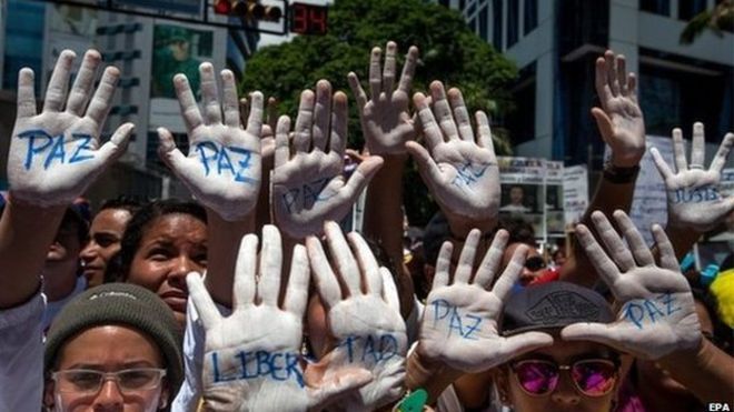Photos Above: This Past Week (2015) thousands of Venezuelans held a peaceful protest, dressed in white symbolic to peace, as Lilian Tintori led the march in Caracas. (Venezuela Opposition March Draws Thousands. BBC. March 31, 2015. http://www.bbc.com/news/world-latin-america-32949924)