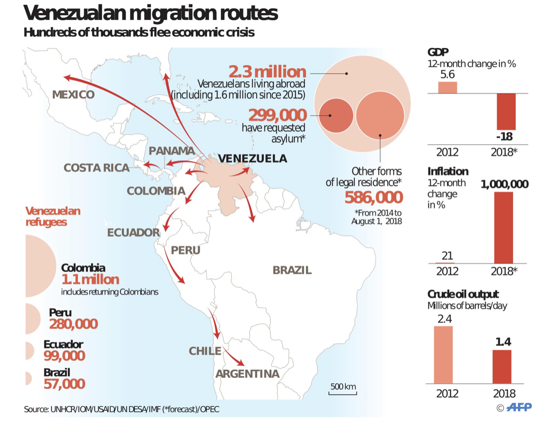 Venezuelans are leaving their country in high numbers, they are fleeing their country’s economic, humanitarian and governmental crisis. A large number of Venezuelans are seeking asylum around the world. Many plea for alternative forms of documentation which allow them to stay in different South American countries where they share common bonds of culture, language, and history. Venezuela is currently experiencing one of the worst refugee crisis. The article Venezuela Is a Refugee Crisis states that “over 3 million people have fled the country over the last few years… [and an estimate of] 25,000 people are fleeing the country every single day”. This is caused by the decrease in access to medicine and shortage of food supplies. Colombia is accepting the vast majority of Venezuelan refugees followed by Peru (500,000), Ecuador (220,000), Argentina (130,000), Chile (100,000), Brazil (85,000), and Panama with 94,000 refugees. As people are moving in these mass numbers it is important to look at how they are doing so. One of the key non-governmental actors in helping guide refugees seek asylum in other countries is social media, (Facebook groups and Whats App), along with the Venezuelan people themselves. Both of these sources, help refugees network and thoroughly plan out their journey despite being miles away from their potential host country.